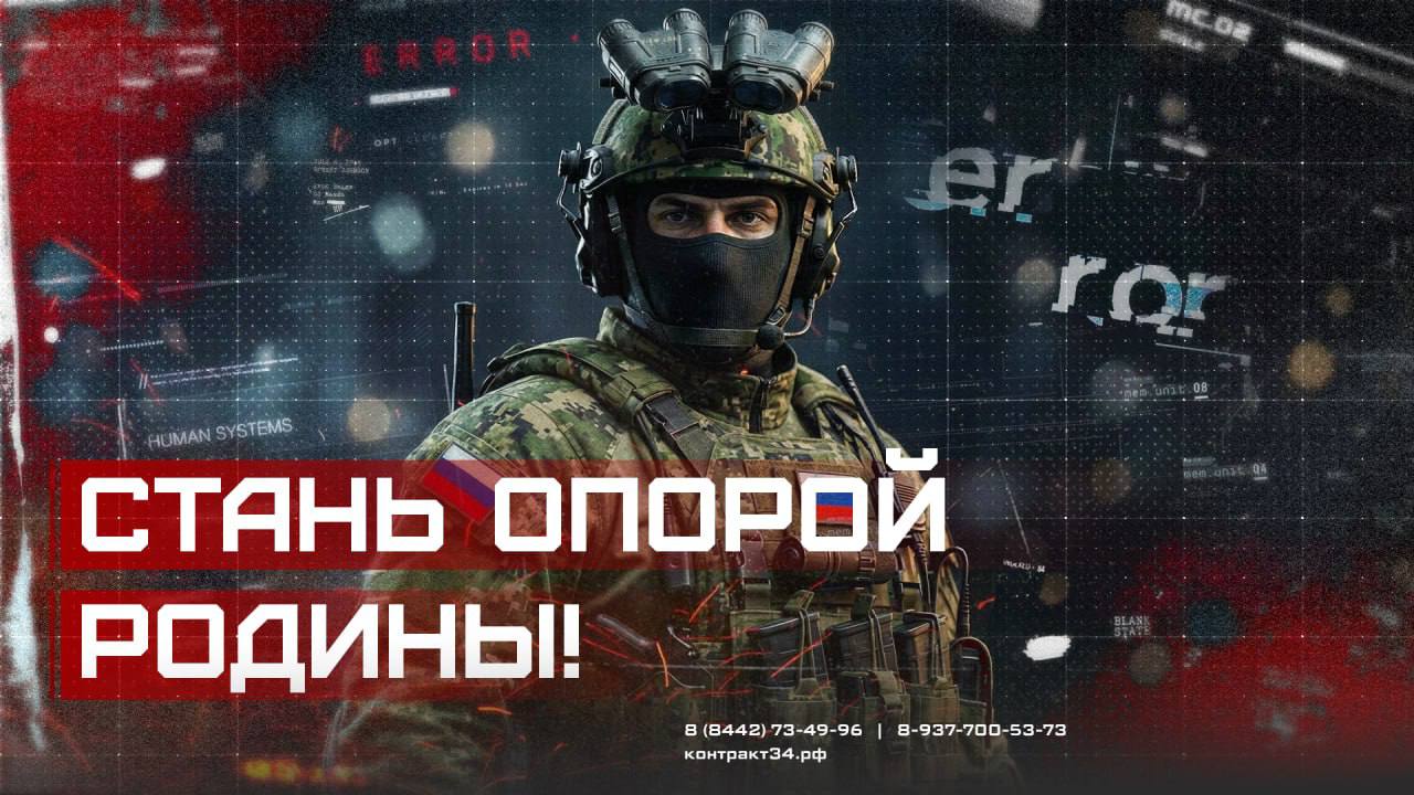 Министерство обороны Российской Федерации проводит набор на военную службу по контракту. Приглашаем мужчин в возрасте от 18 до 65 лет, проживающих в Волгоградской области, присоединиться к рядам Вооруженных Сил. Как заключить контракт: Вы можете обратиться в один из следующих пунктов: Пункт отбора на военную службу по контракту в Волгограде: ул. Советская, 25. Военный комиссариат по месту вашего жительства. Местная администрация. Контактные телефоны для получения информации: (8442) 73-49-96 8-937-700-53-73 Процесс заключения контракта состоит из трех простых шагов: Подача заявки (по телефону или лично). Прохождение медицинской комиссии. Подписание контракта. Финансовая поддержка и социальные гарантии: Выплата за первый год службы: от 4,7 млн рублей. Единовременная выплата при заключении контракта: от 2,1 млн рублей. Предусмотрены федеральные и региональные меры поддержки для военнослужащих и их семей как в период службы, так и после ее завершения. Подробная информация о военной службе по контракту доступна на сайте: https://контракт34.рф ![]() Стань опорой Родины! |