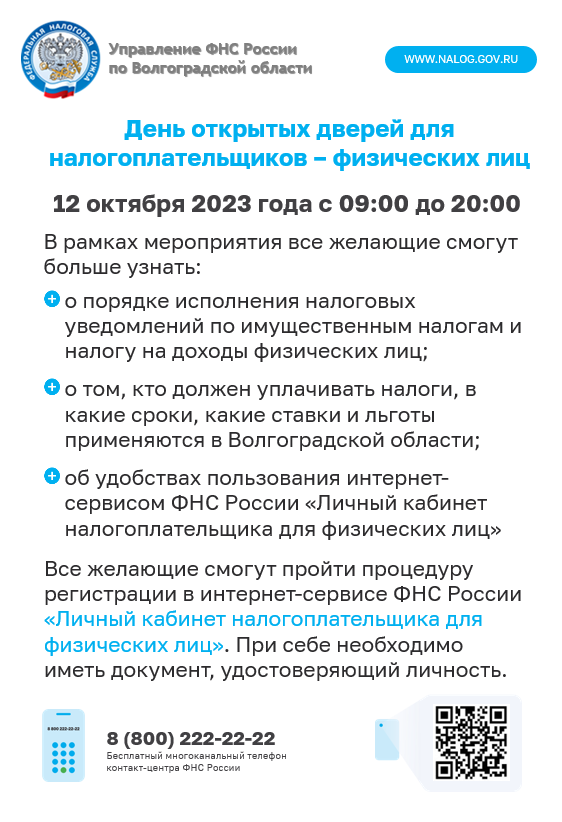 УФНС России по Волгоградской области напоминает, что срок уплаты физическими лицами транспортного, земельного налогов, налога на имущество и налога на доходы физических лиц по налоговым уведомлениям – не позднее 1 декабря 2023 года. 12 октября 2023 года с 9.00 до 20.00 во всех инспекциях Волгоградской области пройдут Дни открытых дверей для налогоплательщиков – физических лиц! В рамках данных мероприятий все желающие смогут уточнить свои налоговые обязательства, подать заявление при обнаружении некорректных сведений в уведомлении; представить документы, подтверждающие право на получение льгот, а также задать интересующие вопросы по порядку исчисления и уплаты имущественных налогов и НДФЛ. Специалисты налоговой службы подробно расскажут о том, кто должен уплачивать имущественные налоги, какие ставки и льготы применяются в конкретном муниципальном образовании, а также ответят на другие вопросы граждан по вопросам налогообложения. Кроме того, все желающие смогут получить доступ к интернет-сервису «Личный кабинет налогоплательщика для физических лиц».