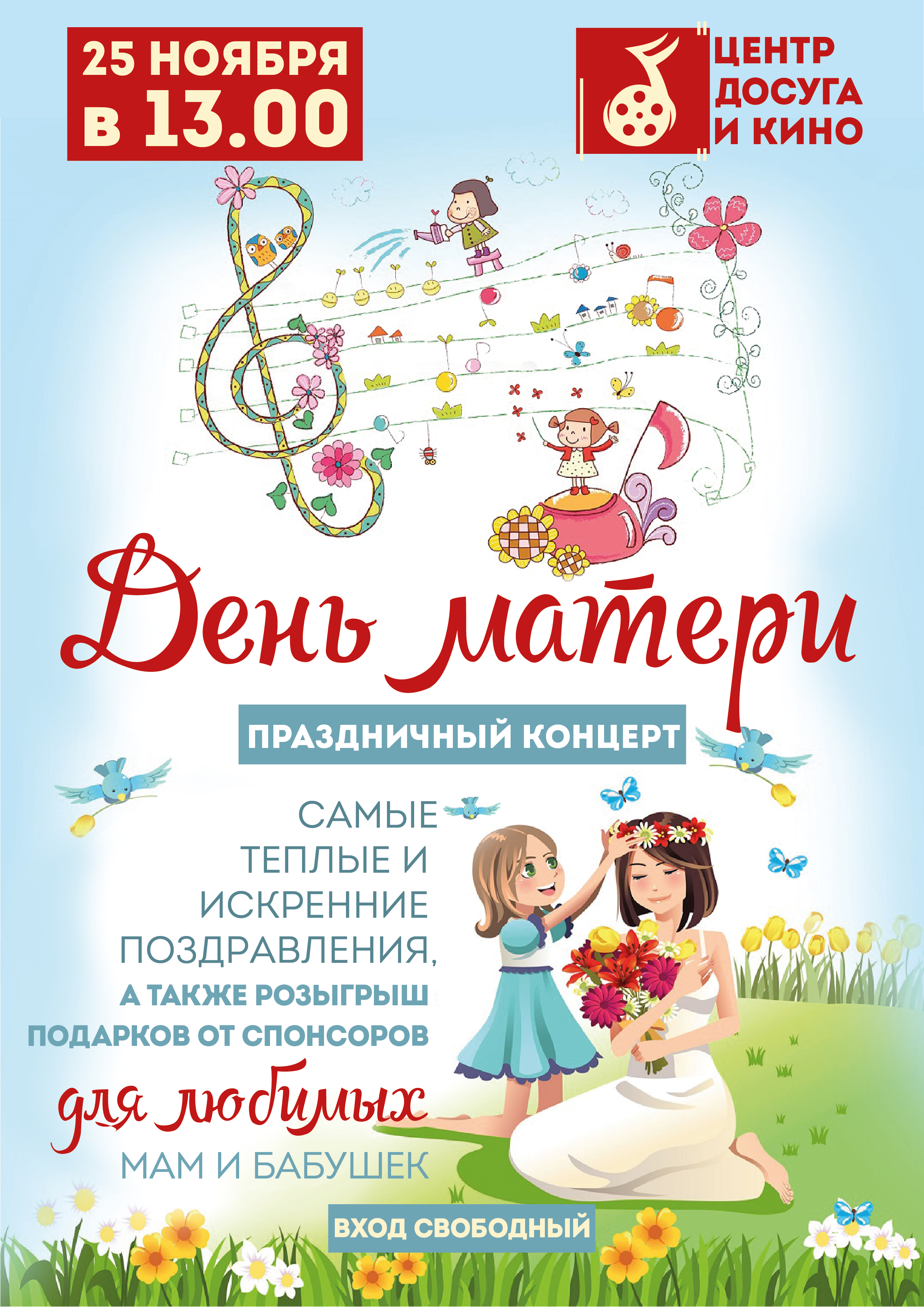 В преддверии праздника Дня матери в России приглашаем всех на семейный концерт «Праздник любви и благодарности», который состоится в МБУК «Центр Досуга и Кино» (кинотеатр). Ждём всех-всех мам, будущих и состоявшихся, новоиспечённых и тех, которые уже бабушки. Мы ждём вас 25 ноября в 13 часов, вход свободный!