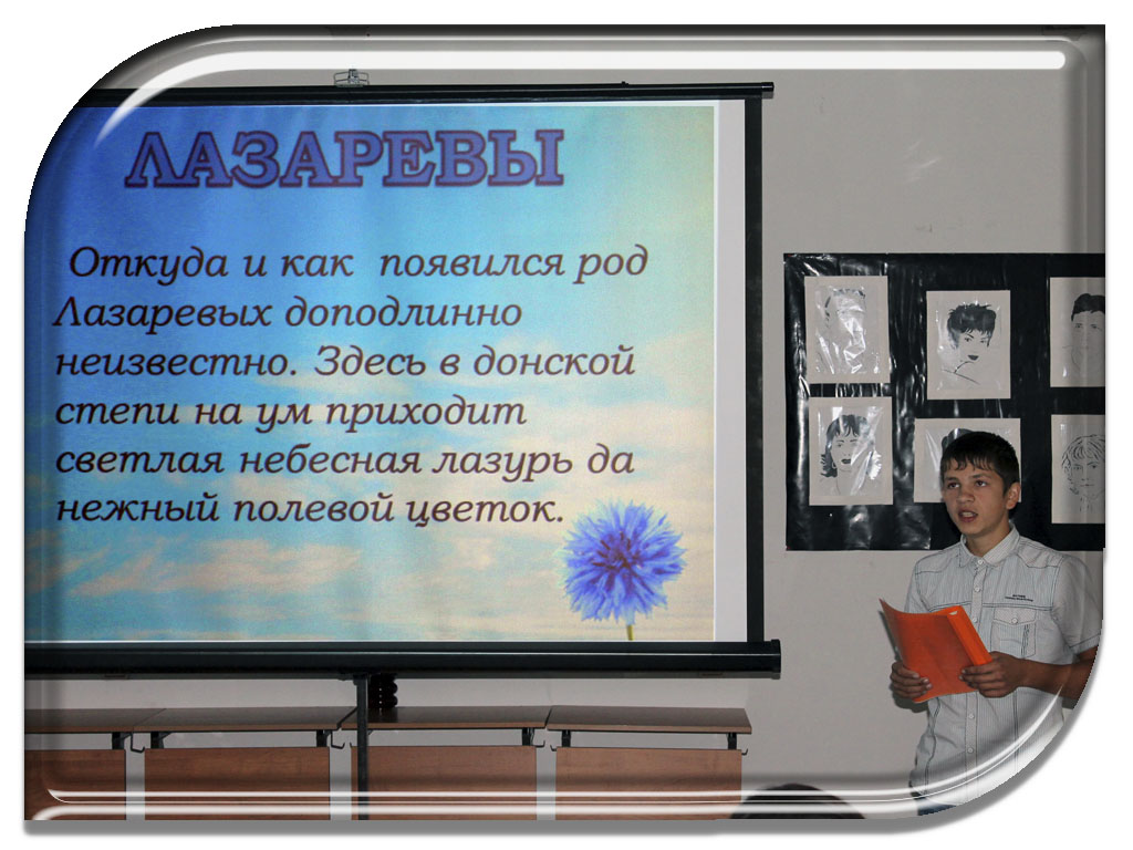 На суд жюри было представлено несколько работ, среди них и работа юного активиста ТОС «Пугачевское» Лазарева Андрея. Он рассказал о пяти поколениях семьи Лазаревых, используя семейные фото разных лет, ответил на вопросы слушателей и жюри по истории станицы Пугачевской, рода Лазаревых. В качестве иллюстрации к защите работы была представлена презентация. Узнавать, кем были и чем занимались твои прародители, всегда интересно. Знание родословной связывает друг с другом поколения и века, дает человеку надежду на новое будущее. К сожалению, время не всегда позволяет сохранить наглядную память: картины, эстампы, рисунки, фото. Но в неравнодушном сердце должна сохраняться каждая частица души предков, которая должна передаваться из поколения в поколение.
